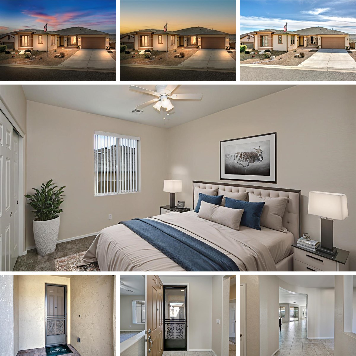 Outside, the professionally landscaped yards are designed for easy care, featuring a drip watering system and an array of native cactus. The extended rear yard boasts a covered paver patio and a barbecue area with a gas hookup, perfect for entertaining under the stars while enjoying panoramic views of the rolling hills, Bradshaw Mountains, Mingus Mountain, and twinkling city lights. Additional upgrades include brushed nickel fixtures, casita- stacked washer and dryer & refrigerator, 6-panel doors, an 8-foot tall garage door with a keyless entry system, and insulated garage door with window and shelving - ensuring every detail is attended to.