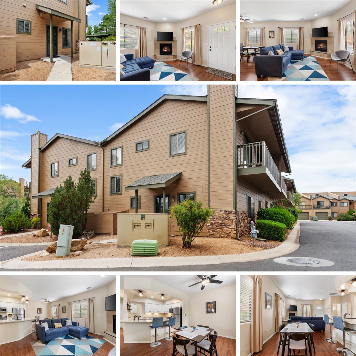 Darling Townhome, minutes to the heart of downtown Prescott, right next to shopping, dining and close to schools. Perfect for 1st time home buyers, downsizing or 2nd home vacationers. 2 master suites with Vaulted Ceilings, Sliding Doors to private balcony, open floor plan, granite counters in kitchen, SS appliances include gas range, dishwasher, microwave oven, natural gas fireplace, Large indoor laundry with washer/dryer. Utility room on main level has additional storage, could build in Pantry, 50 gallon water heater, natural gas heat. Covered parking space #43 directly across from unit, and open space #63 in front of unit. Recent renovations by HOA include new exterior paint and new community pavement throughout. HOA includes trash and roof maintenance. Ready for you to enjoy Prescott's amazing trails and downtown events year around.