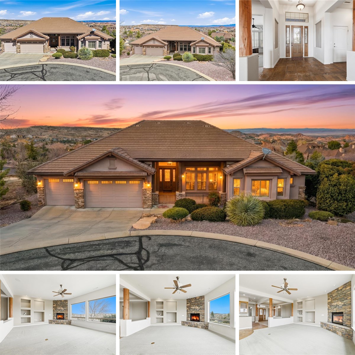 Luxury living meets unmatched views in this rare Carrington-built gem. Perfectly situated on a premier almost half-acre cul-de-sac lot, this single-level residence offers the ideal blend of privacy and grandeur. Boasting soaring 10-foot ceilings, an all-tile roof, and breathtaking, expansive vistas, this home provides the freedom of no HOA alongside the convenience of all city services. Just inside the entry, a sophisticated dedicated office offers the perfect space for work or reflection. The heart of the home features a formal dining room accented by rustic lodgepole separators, which flows seamlessly into a magnificent great room. Here, a cozy corner fireplace and large windows perfectly frame the stunning outdoor scenery, creating an inviting atmosphere for relaxation or entertaining.The kitchen is a chef's dream designed for gathering. Featuring granite countertops, an abundance of upgraded cabinetry, a wine refrigerator and bar area, gas stove, Jenn-Air grill, it truly has it all. Designed with the ultimate split floor plan for maximum seclusion, the primary wing is a true sanctuary boasting two walk-in closets, a private covered patio, and a spa-like bathroom with dual split sinks, a dedicated vanity area, a deep soaking tub, and a walk-in shower. Entirely separate from the primary suite, the secondary bedrooms offer exceptional privacy, each functioning as a junior suite with its own en-suite bathroom and walk-in closets, one having separate entrance. The 3-car garage, which is equipped with oversized 8-foot doors to easily accommodate larger vehicles, has cabinets, a sink, and plenty of light from the well placed windows. Surrounded by easy-care landscaping, the expansive lot provides multiple covered outdoor spaces, serving as a peaceful vantage point to enjoy legendary Prescott sunsets and stunning, expansive views of the Granite Mountain and San Francisco Peaks. This move-in ready home is a rare find in one of the most desirable locations in Prescott. A short drive to downtown historic Prescott courthouse, countless restaurants, boutique shopping, and hiking trails. A voluntary social membership to the Prescott Lakes Clubhouse, which includes the restaurant and social events is available with a monthly fee. Separately, Prescott Lakes private golf membership is available, and the club membership, which includes fitness/exercise Cnt, pool, spa/hot tub, tennis, and pickleball, may be added to the golf membership. This home definitely checks all the boxes! Come take a look!