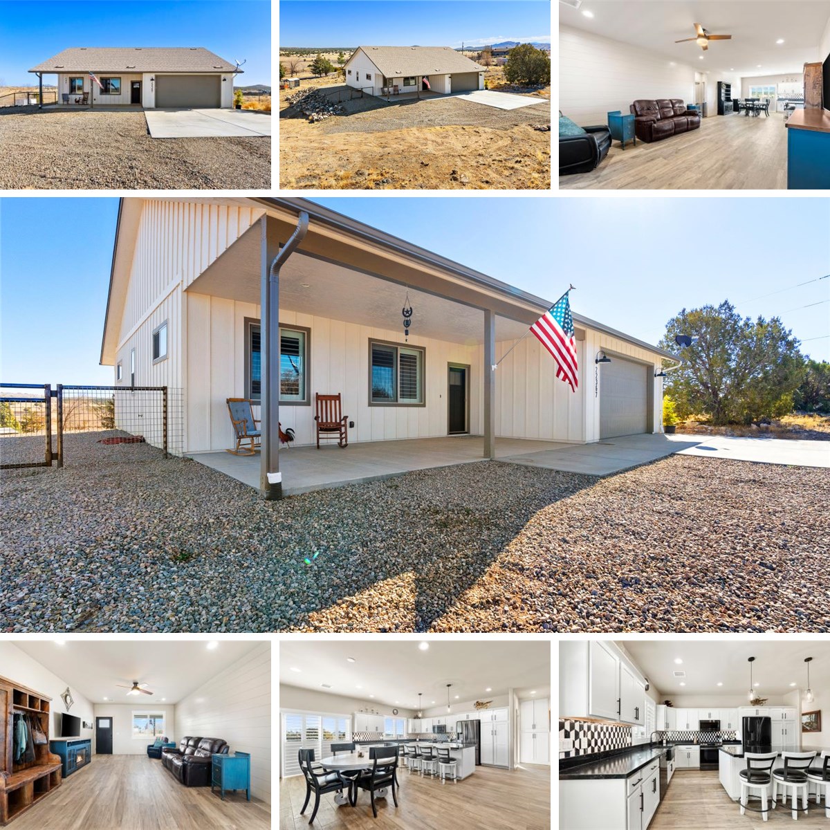 Step into this modern farmhouse perched in Malapai Ridge Estates, where wide-open views and Arizona skies take center stage. Located on the desirable south end of Paulden, this property offers easy paved road access and a convenient commute to Chino Valley, Prescott, and surrounding areas. This 3-bedroom, 2-bath home delivers a clean, modern feel with thoughtful design and an open-concept layout that flows easily for both everyday living and entertaining. Inside, you’ll find shiplap accents, large plank porcelain tile throughout, and plantation shutters that add character without overpowering the space. The kitchen is designed to gather—featuring granite countertops, quality appliances, and generous prep space that makes it both functional and inviting. The primary suite offers a comfortable retreat, complete with a well-appointed bath showcasing upgraded Beliz Azul tile. Additional features include a water softener for added comfort and efficiency. Set on 2.09 acres, the fully fenced property provides usable land with flexibility for a variety of needs. Horses and farm animals may be allowed, and there’s ample room for outdoor toys, trailers, or future expansion. Whether you're envisioning a large RV garage, workshop, or additional living space, the property offers the space and layout to bring those ideas to life. With over $50,000 in upgrades already completed, much of the work has been done—offering a move-in ready opportunity with room to grow.