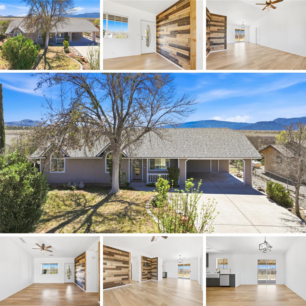 Welcome home to this beautifully updated property backing directly to Coconino National Forest! Situated on .20 acres, this 1,254 square foot home offers wonderful views of Porcupine Peak and the surrounding mountain range from your backyard, with a bit of views of the white mountains from the front. The kitchen is truly a showstopper, featuring Samsung Bespoke appliances, stunning quartz countertops with a waterfall edge, custom cabinetry with soft-close drawers and doors, and a classic farmhouse sink perfectly positioned beneath a window overlooking the backyard. Inside, you’ll find new tile flooring throughout and a custom wood accent wall that adds warmth and character to the living space. The home offers 3 bedrooms, including a primary suite with private access to the covered back patio—perfect for enjoying peaceful mornings and mountain views. Both bathrooms have been thoughtfully updated with modern finishes. The primary bath features a custom step-in shower, upgraded vanity, and new lighting, while the hall bath continues the same cohesive design. Additional highlights include a spacious laundry room with extra storage and pantry space, a Nuvo water filtration system, and convenient backyard access. Step outside to a large covered patio that takes full advantage of the property’s privacy and stunning natural backdrop. The fully fenced yard includes a rolling front gate, a covered two-car carport, and a separate pedestrian gate for easy access. A spacious workshop provides ample room for projects, hobbies, or additional storage. The front yard features two green apple trees and a peach tree, adding charm and seasonal enjoyment. Recent upgrades include new roof shingles (2025) and a gas pack HVAC in 2024.